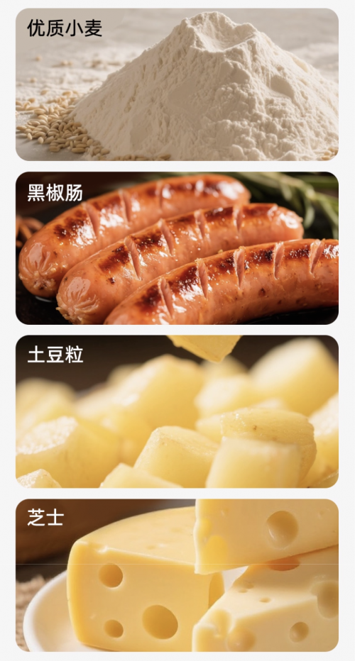 更让人放心的是,它坚持手工制作+短保新鲜,拒绝香精、色素、防腐剂的添加,配料表干净纯粹。优质小麦提供复合碳水,黑椒肠补充蛋白质,芝士和土豆粒带来适量脂肪,营养配比均衡,既能作为早餐快速补充能量,也能当健身后的代餐,帮你高效恢复体力,还不担心给身体添负担。